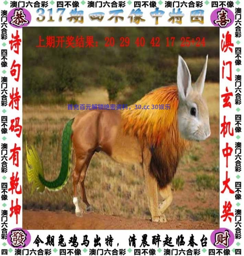 | 317期:【轻语解四不像】 【本期七肖】兔鸡马虎狗羊鼠 【平特一尾】888尾 |